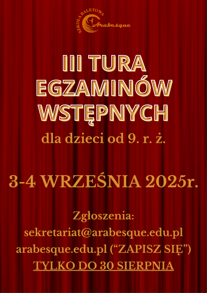 Serdecznie zapraszamy wszystkich uzdolnionych kandydatów między 9. a 15. r. ż. na III TURĘ EGZAMINÓW WSTĘPNYCH do Niepublicznej Szkoły Sztuki Tańca ARABESQUE w Katowicach!